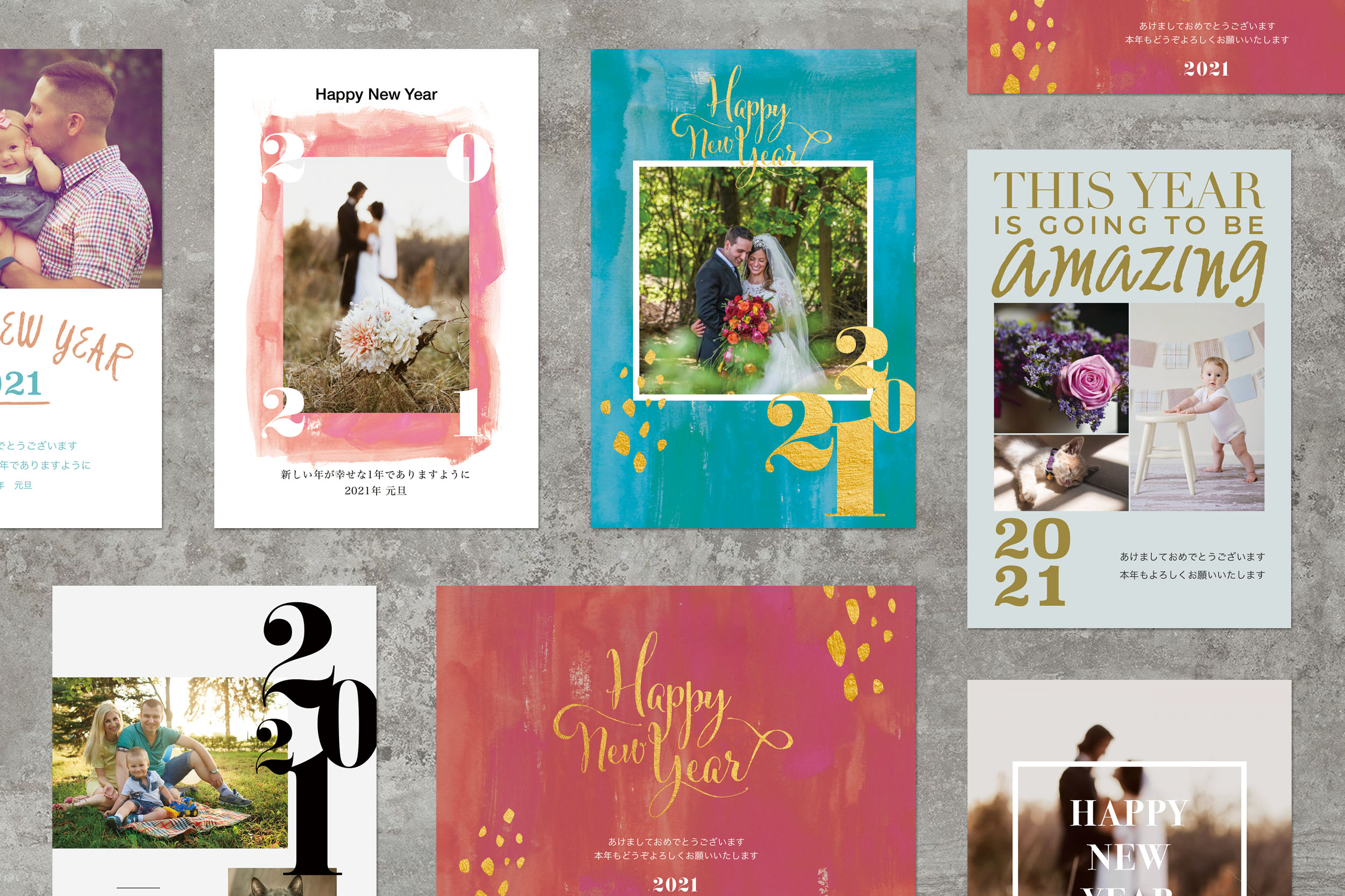 キヤノンの2021年賀状アプリ用デザインです。ユーザーが好きなデザインを選んで写真を入れたり文章を入力して、簡単に綺麗な年賀状が作れるアプリです。7点のデザインを提供させていただきました。