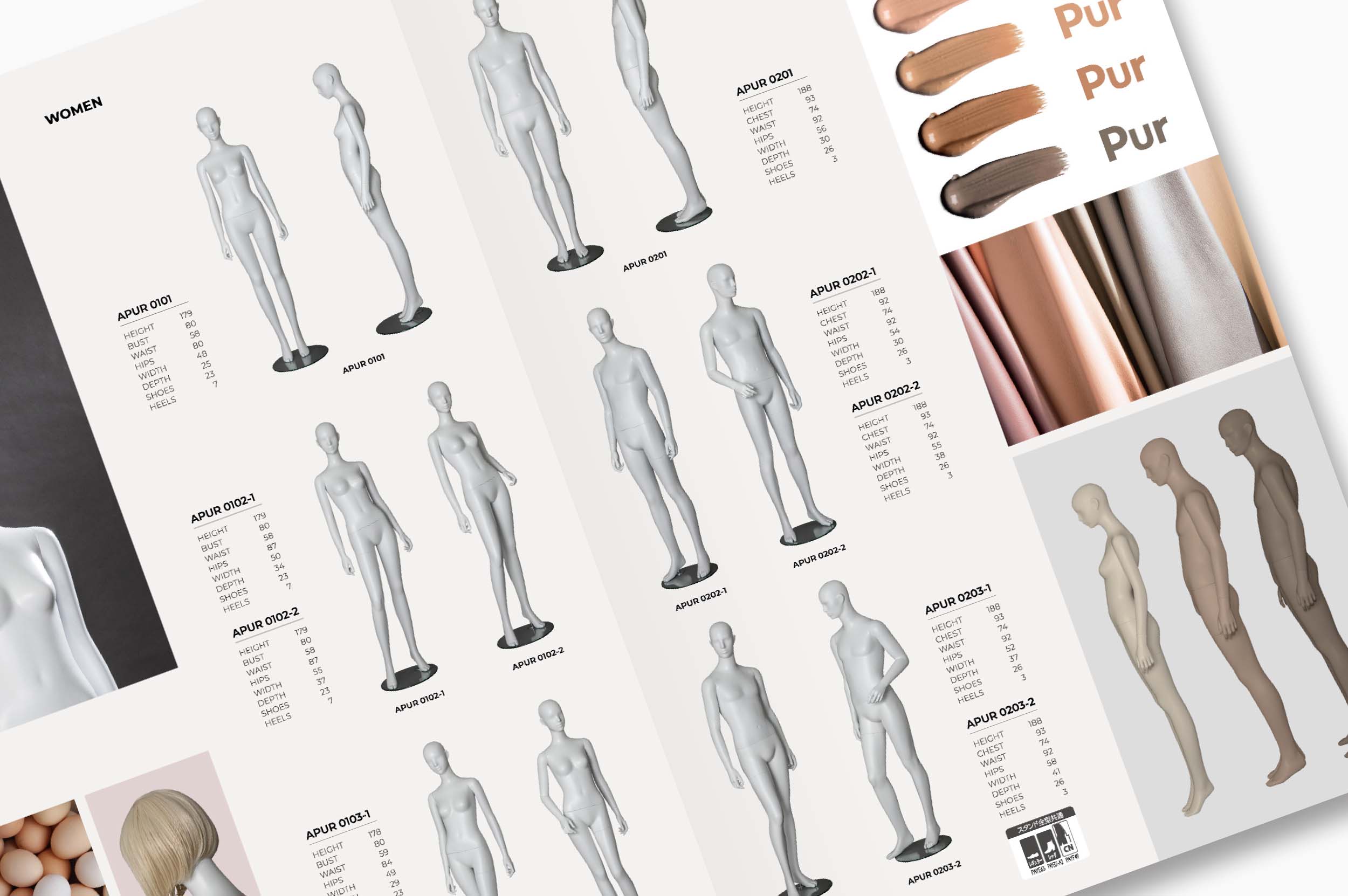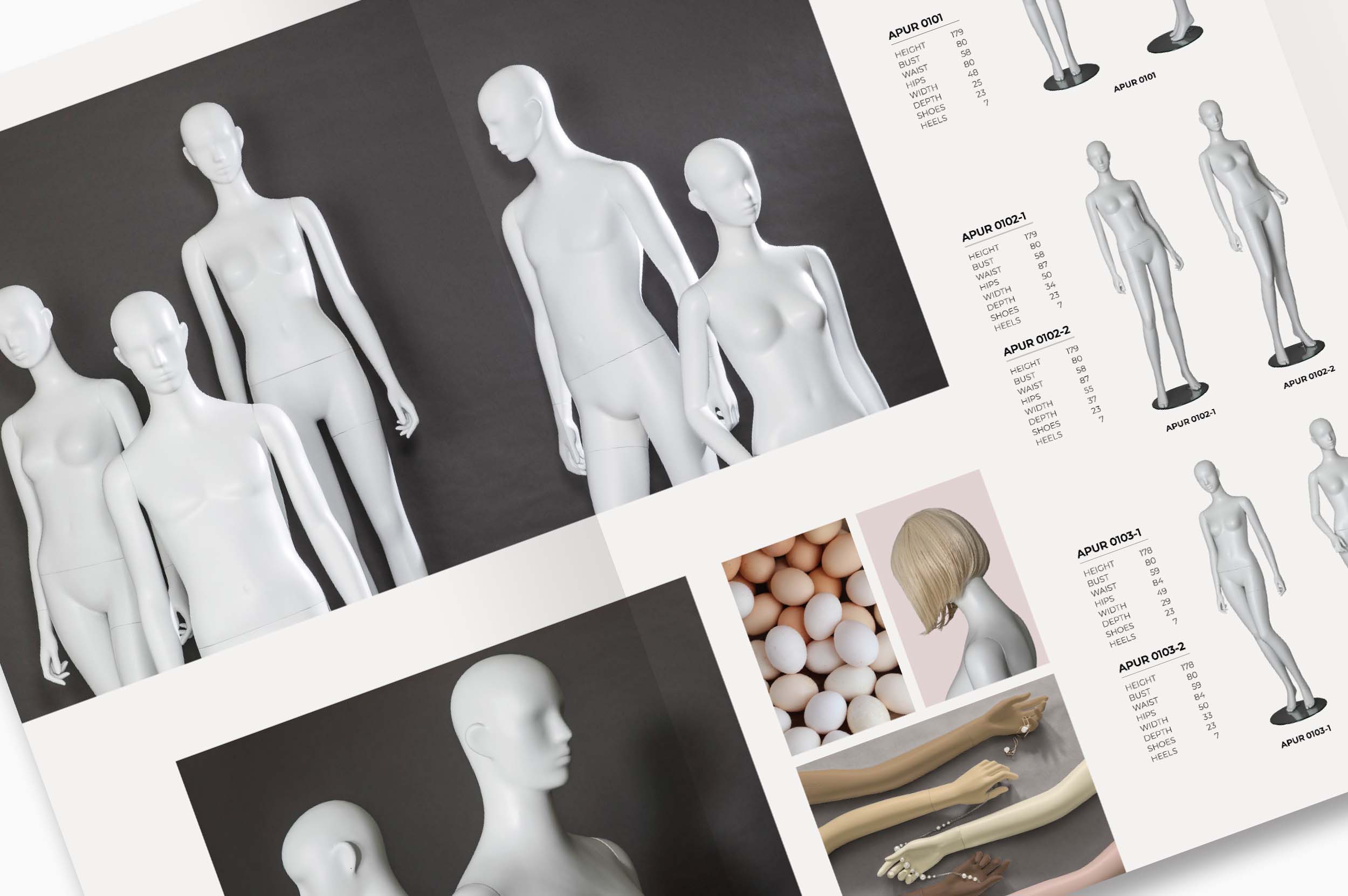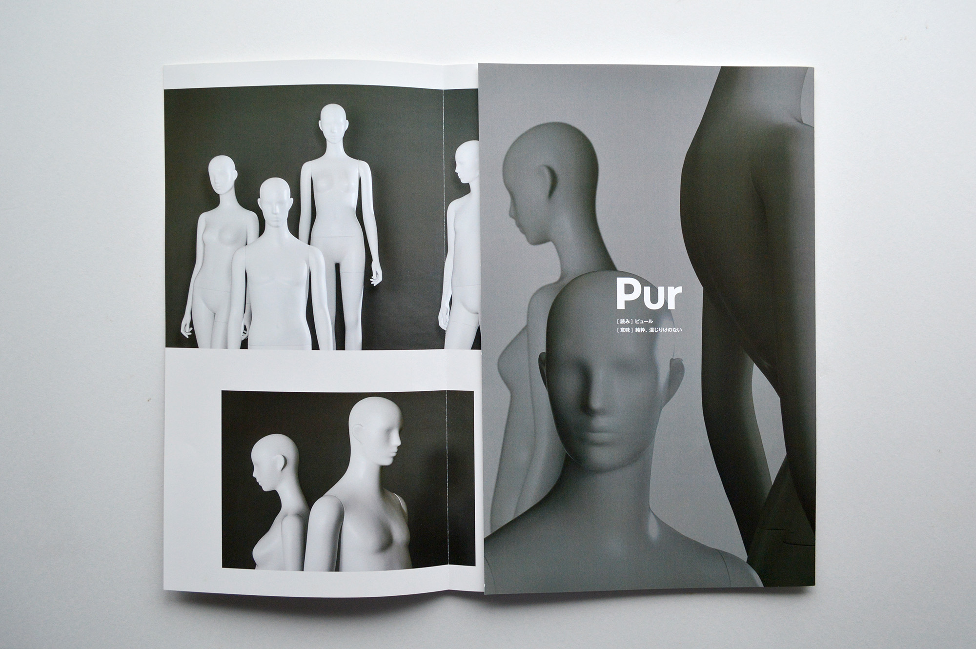 新しいマネキンブランドのためのパンフレットデザイン。表紙の幅をあえて短くして後ろのページが少し見えるように設計。トリミングされる隙間からマネキンの一部を覗かせることで、プロダクトの美しい曲線にフォーカスさせました。ページをめくる行為の中にストーリーを感じさせるデザインとしました。