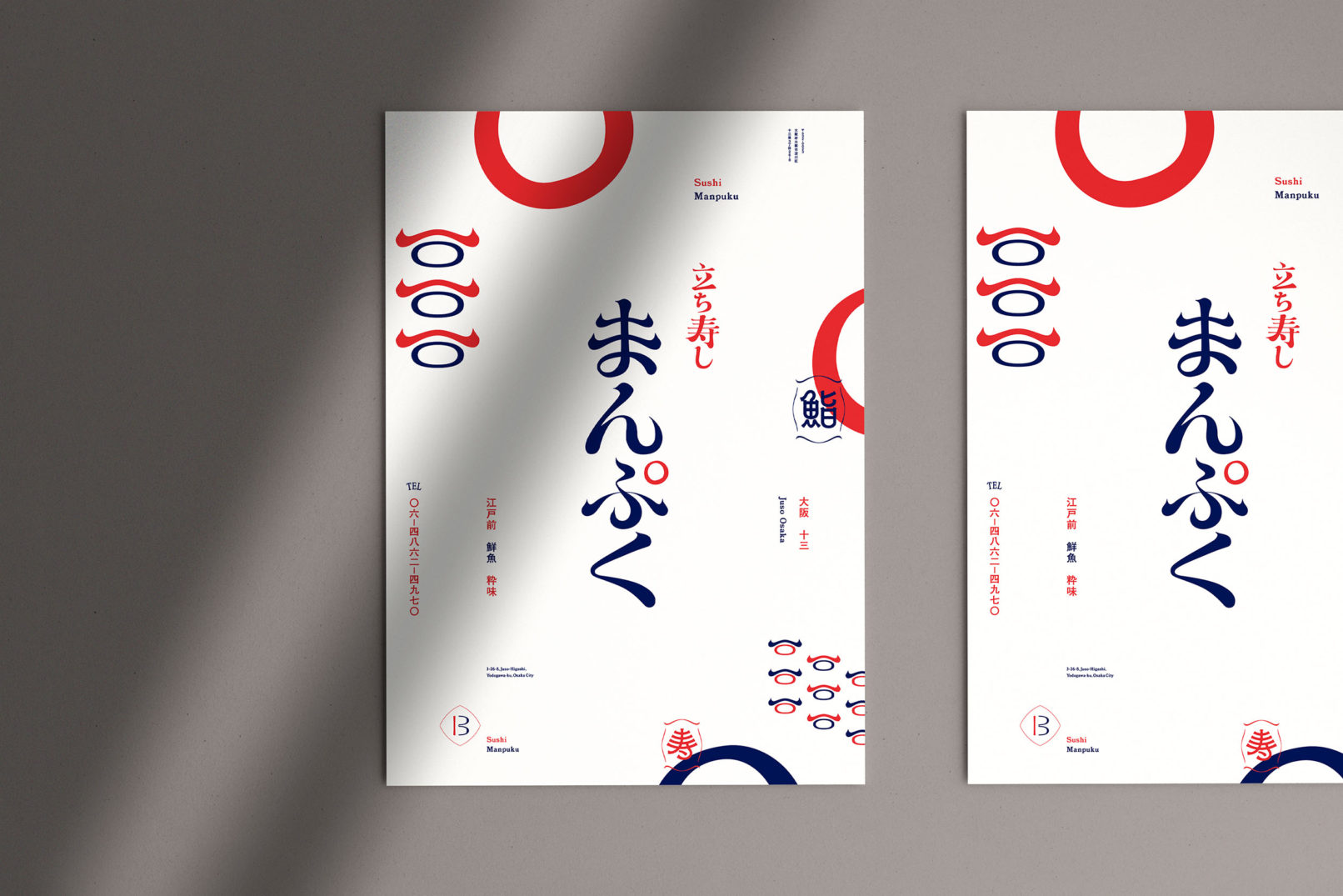 This poster expresses the fun of sushi with simple graphics. The limited number of colors and typography makes it different from other restaurants.
