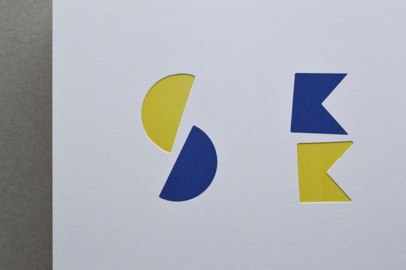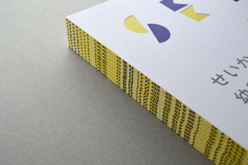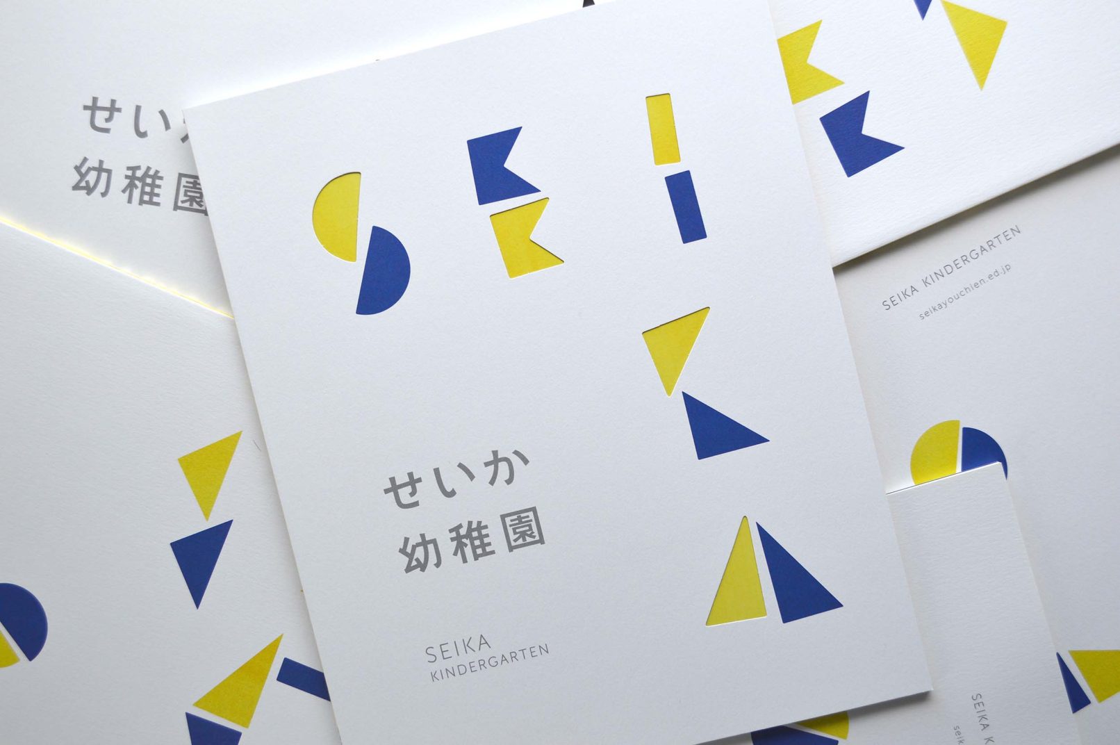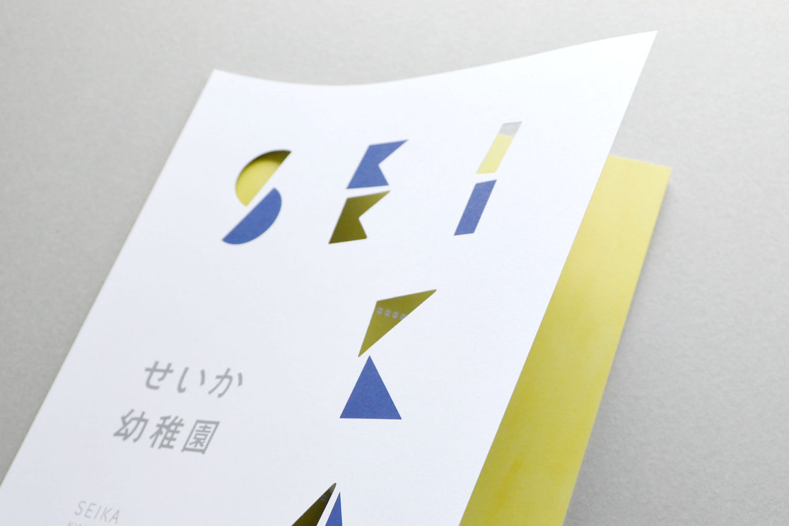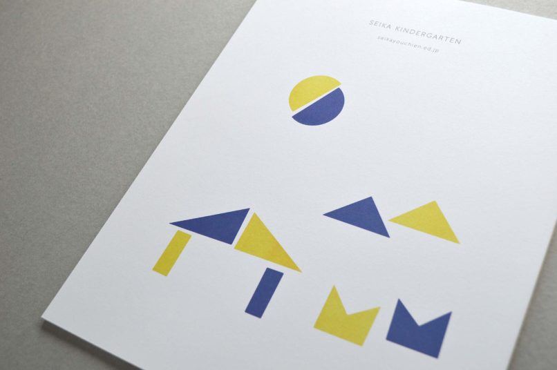 表紙には印刷の型抜きを使って、一つの形が連続することで幼稚園の名前になる図形遊びを取り入れました。裏表紙では同じ図形が幼稚園の園舎と地域の風景を描いています。