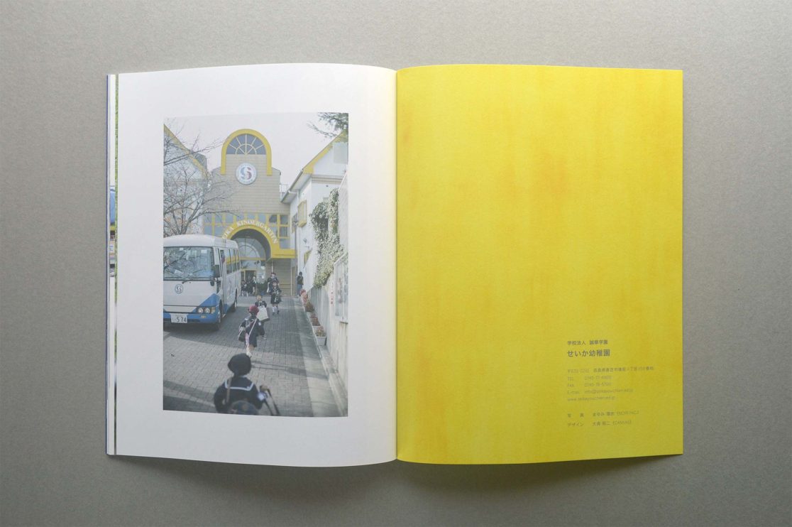 奈良県のせいか幼稚園案内パンフレット。園長先生から最初にお話を伺ったのは、「写真集のようなパンフレットを作りたい。」ということでした。そこで子供達や先生方の自然な表情、遊びや行事、園舎の風景など、季節の移り変わりとともに変化する日常の様子を一年を通して撮影し、一冊にまとめました。